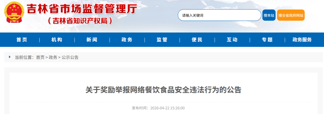 为深化治理网络餐饮食品安全问题,及时发现和有效控制餐饮食品安全风险隐患,发挥社会监督效能,现就奖励举报网络餐饮食品安全违法行为的有关事项公告如下。