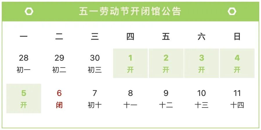 为丰富大众节日文化生活,满足大众参观游览需求,延边博物馆五一劳动节假期5月1日至5月5日正常开放。参观时间为9:00—17:30(17:00停止入馆。)因5月4日(周一)为法定节假日,原定周一闭馆顺延至5月6日闭馆。5月7日起正常开放。参观时间:9:00—16:30(16:00停止入馆。)