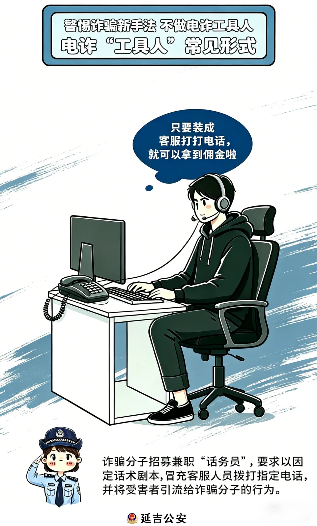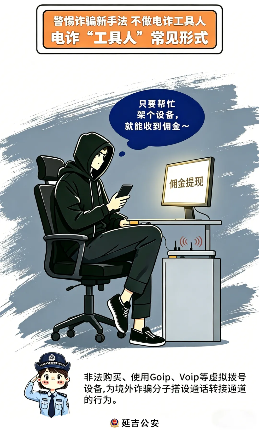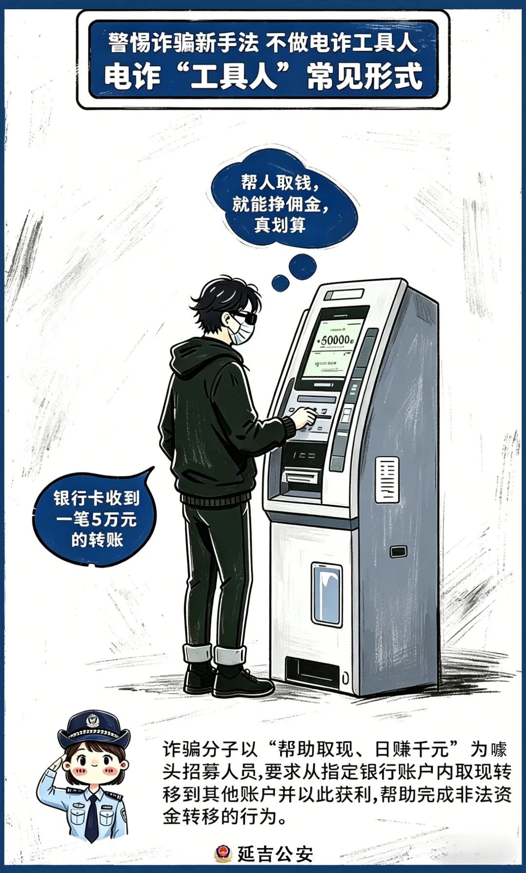 近期,公安机关在工作中发现,电信网络诈骗犯罪团伙大肆雇佣相关人员(俗称“取现车手”)专门从事诈骗赃款取现、转运、洗白违法活动,通过异地流窜取款、分散支取现金、密闭空间交接、秘密转移赃款等方式,协助犯罪分子洗白涉案资金,成为电信网络诈骗犯罪的重要帮凶,相关行为已严重触犯国家法律法规。