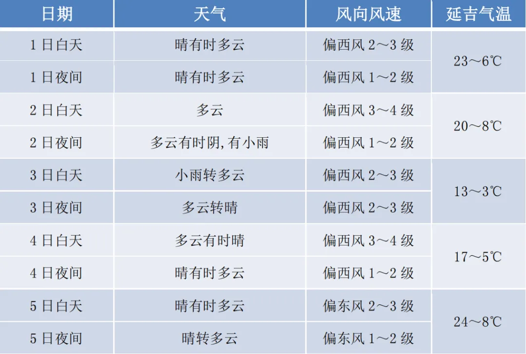 预计“五一”假期(5月1日—5日)延边州以晴好天气为主,2日夜间至3日白天有小雨,延边州平均降水量为3毫米~6毫米,比常年同期少4毫米左右;延边州平均气温为11.5℃左右,比常年同期高0.4℃左右。期间,风力不大。